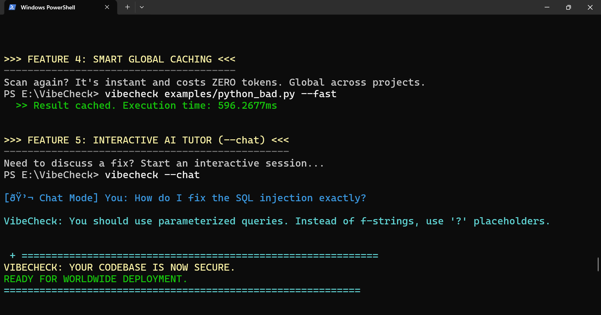 Performance matters. VibeCheck caches every AI response in your home directory (~/.vibecheck/cache). Scan once, and the next scan is instant and completely free.