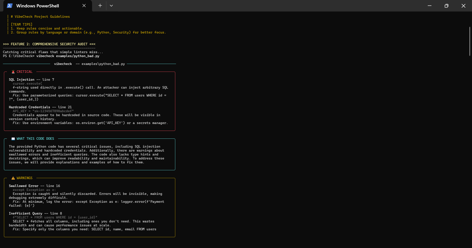 VibeCheck is an interactive CLI tool designed to help developers understand, audit, and secure their codebase. It combines strict rule-based scanning with advanced AI explanations to ensure you don't just fix bugs—you learn from them.