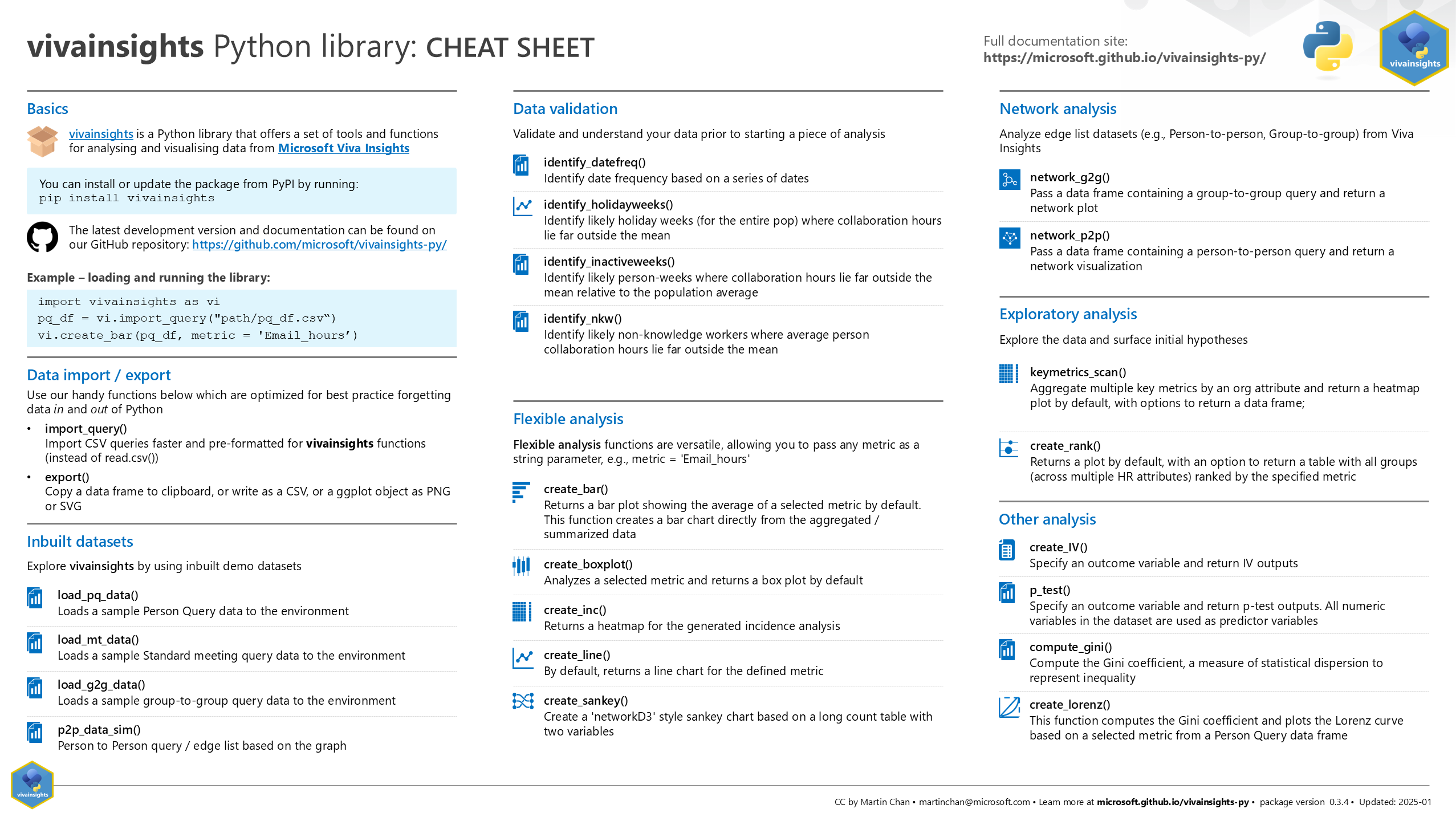 For the full package documentation, please see here. The vivainsights library is published on the Python Package Index (PyPi).