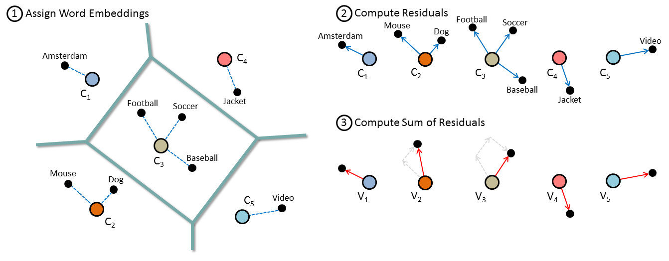 As illustrated in the Figure below, VLAC clusters word embeddings to create k concepts. Due to the high dimensionality of word embeddings (i.e., 300) spherical k-means is used to perform the clustering as applying euclidean distance will result in little difference in the distances between samples. The method works as follows. Let wi be a word embedding of size D assigned to cluster center ck. Then, for each word in a document, VLAC computes the element-wise sum of residuals of each word embedding to its assigned cluster center. This results in k feature vectors, one for each concept, and all of size D. All feature vectors are then concatenated, power normalized, and finally, l2 normalization is applied. For example, if 10 concepts were to be created out of word embeddings of size 300 then the resulting document vector would contain 10 x 300 values.