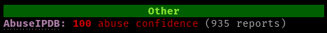 The AbuseIPDB field name is a hyperlink (if terminal-supported) that takes you to the specific AbuseIPDB database page for your query.