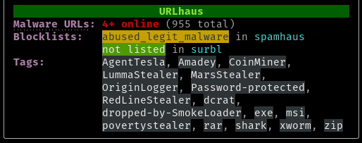 The Malware URLs field name is a hyperlink (if terminal-supported) that takes you to the specific URLhaus database page for your query.