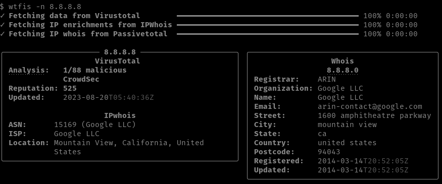 wtfis is a commandline tool that gathers information about a domain, FQDN or IP address using various OSINT services. Unlike other tools of its kind, it's built specifically for human consumption, providing results that are pretty (YMMV) and easy to read and understand.