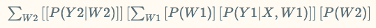 p.parse()will give us the latex expression\sum_{W2}\left[\left[P(Y2|W2)\right]\right]\left[\sum_{W1}\left[P(W1)\right]\left[P(Y1|X, W1)\right]\right]\left[P(W2)\right] -