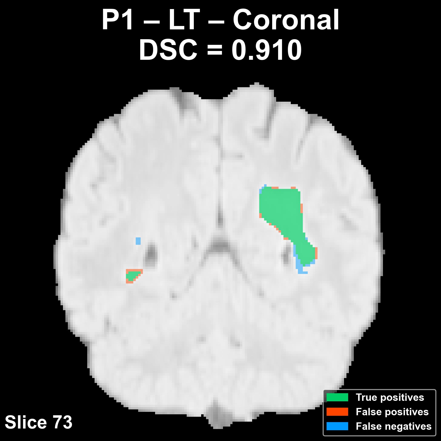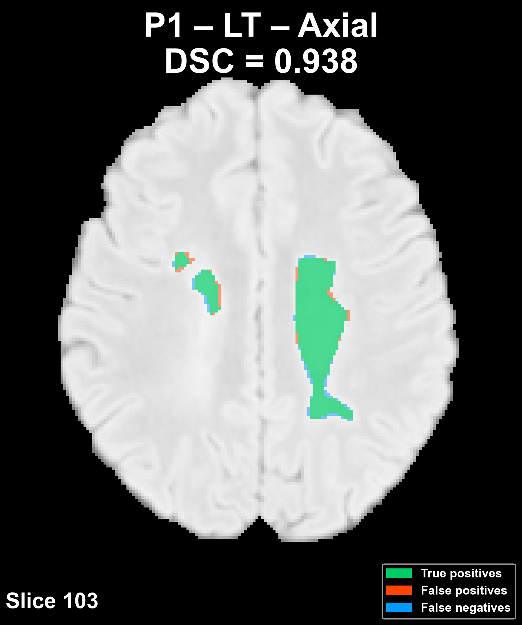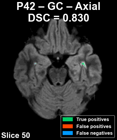The following animation shows the segmentation generated for another reference patient (P42) across all slices of the volume in the axial plane.
