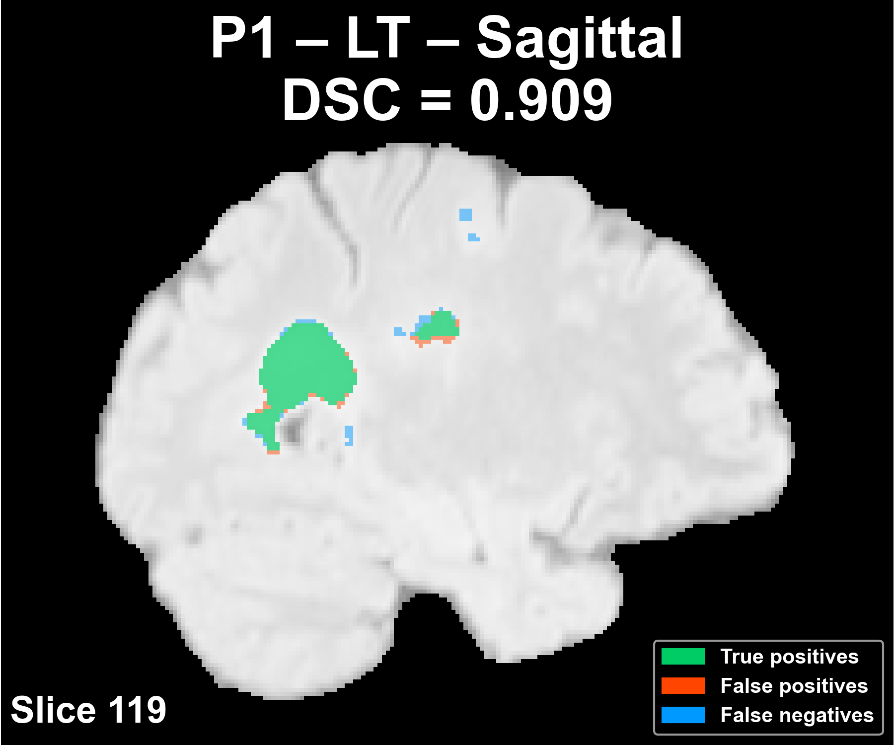 The following example corresponds to a reference patient (P1) and shows the overlay of the automatic segmentation on the FLAIR image in the axial, coronal, and sagittal planes.
